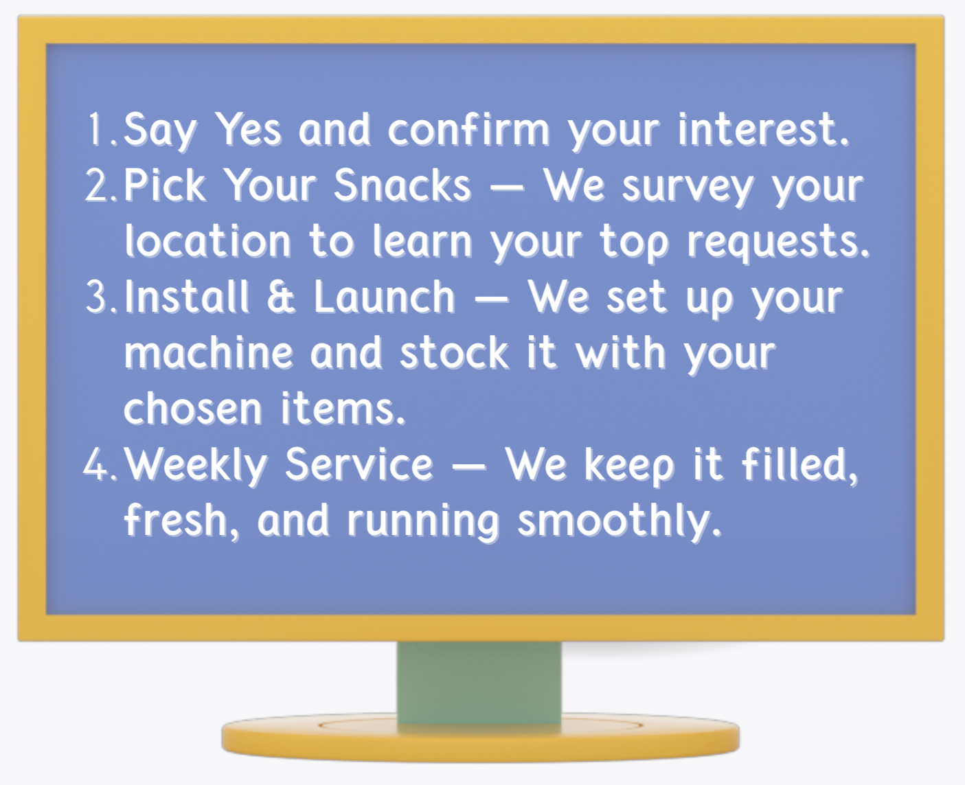 Bring 24/7 snack and drink access to your location with no upfront cost, no maintenance headaches, and no extra work for you. We install, stock, and service the machines — you enjoy happier customers, tenants, or employees.